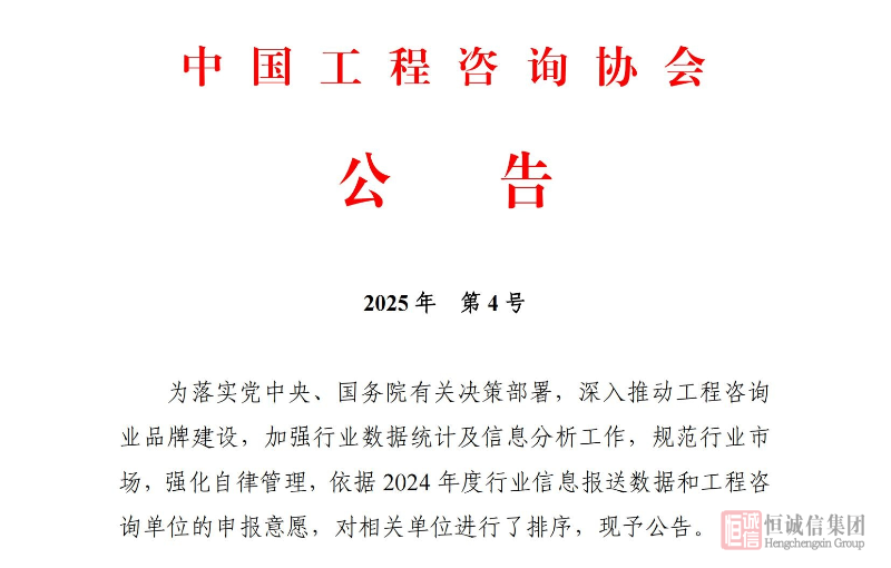 近日,中国工程咨询协会正式发布《关于2024年度工程咨询单位排序的公告》,恒诚信国际工程咨询有限公司凭借出色的综合实力与稳健的业绩表现,成功上榜两项权威排名。该排名是中国工程咨询协会基于对全国众多单位...